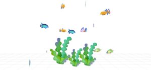 Le cercle en ciment marin écologique est augmenté par des poissons et des algues qui semblent bouger avec le cercle, accompagnés d’une animation sonore.