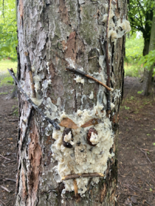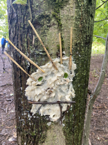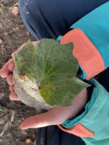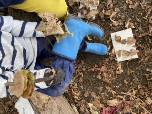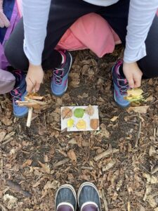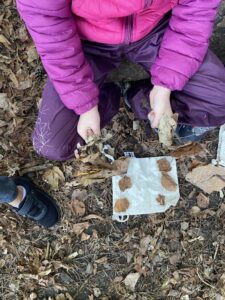 Ce matin, nous avons fabriqué ces jolies mangeoires que nous avons disposé un peu partout dans la forêt ! Il a fallu faire fondre la graisse de coco sur le feu avant d’y introduire les graines et mélanger le tout !