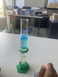 Les deux jeunes femmes ont tout d’abord réalisé l’expérience de « la lampe à huile » en donnant à chaque duo, un cylindre d’huile avec un fond de bicarbonate de soude ainsi qu’un petit bécher de vinaigre coloré selon les envies des élèves. Grâce à une petite pipette les élèves ont ajouté des gouttes de vinaigre coloré dans le tube d’huile et Tadaaaaam