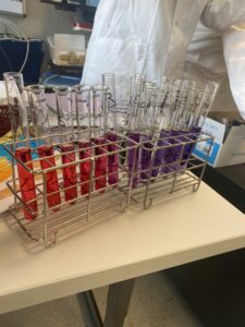 Par la suite, les gymnasiennes ont manipulé différentes éprouvettes remplies d’un liquide préalablement dosé pour l’expérience. Elles ont ajouté à chaque fois la même quantité de chou rouge et magie!! Nous avons obtenu un dégradé de teintes magnifiques!