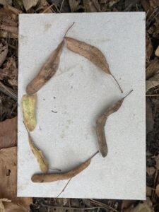 On a crée nos dizaines en enfilant 10 feuilles sur un bâton et on a composé petit à petit notre nombre du jour !