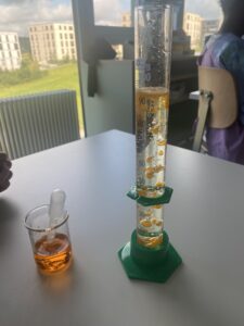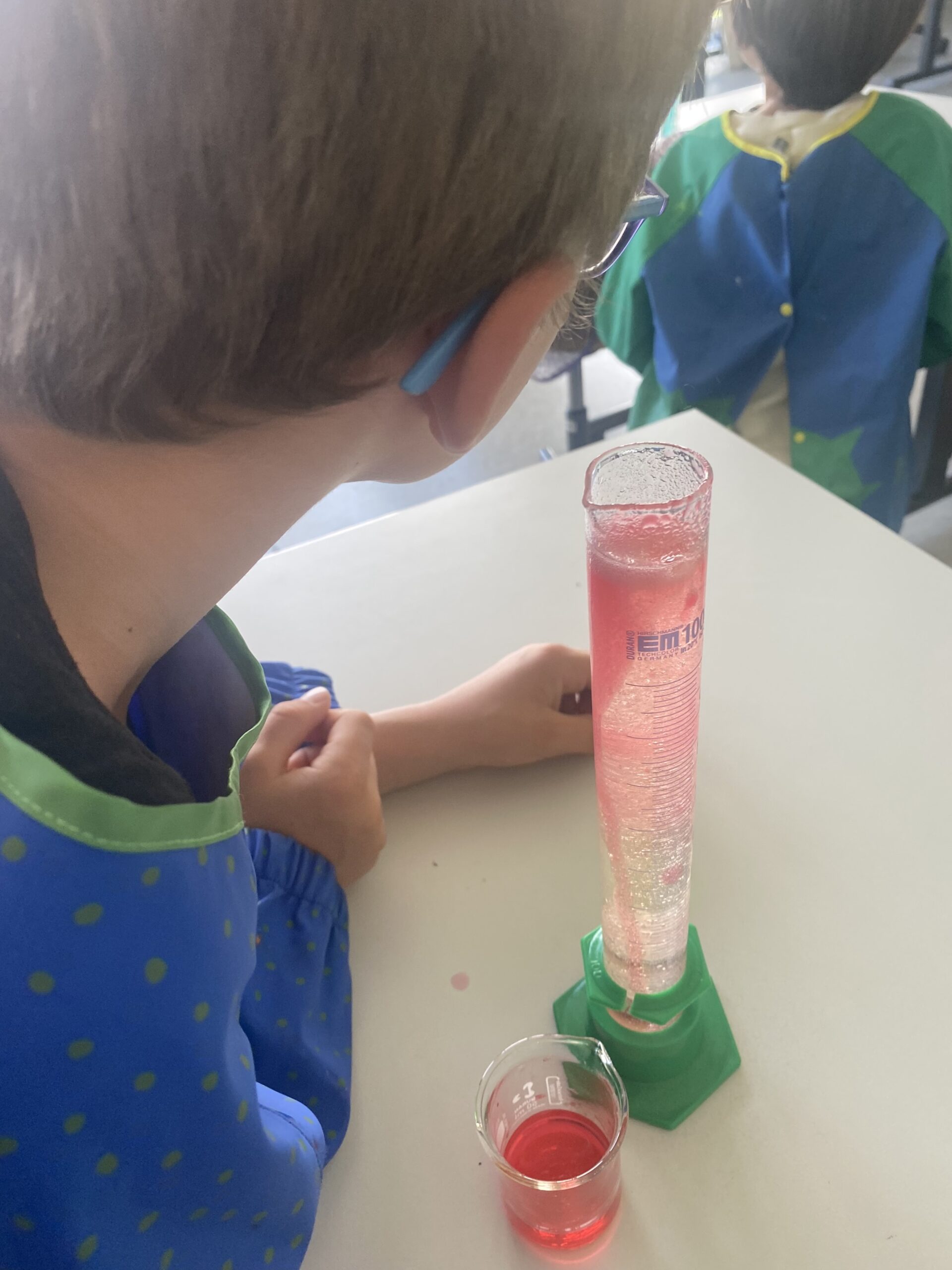 Les deux jeunes femmes ont tout d’abord réalisé l’expérience de « la lampe à huile » en donnant à chaque duo, un cylindre d’huile avec un fond de bicarbonate de soude ainsi qu’un petit bécher de vinaigre coloré selon les envies des élèves. Grâce à une petite pipette les élèves ont ajouté des gouttes de vinaigre coloré dans le tube d’huile et Tadaaaaam