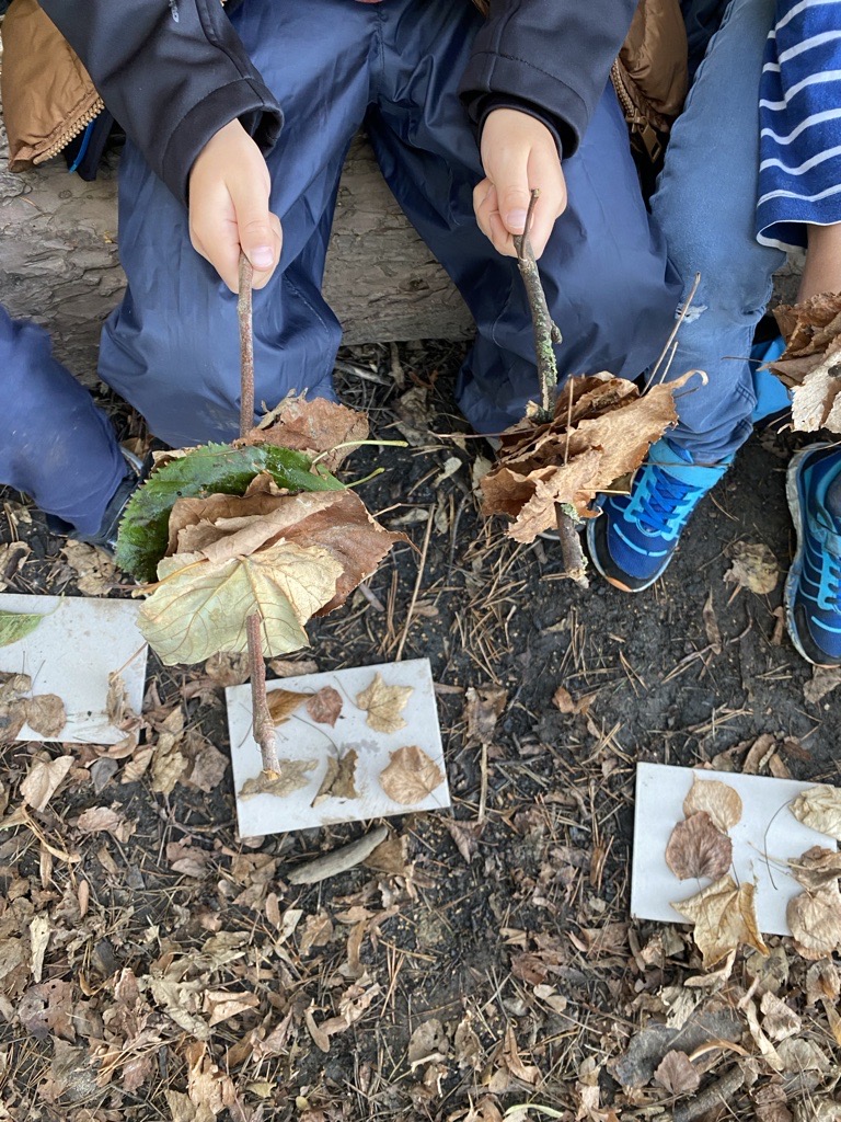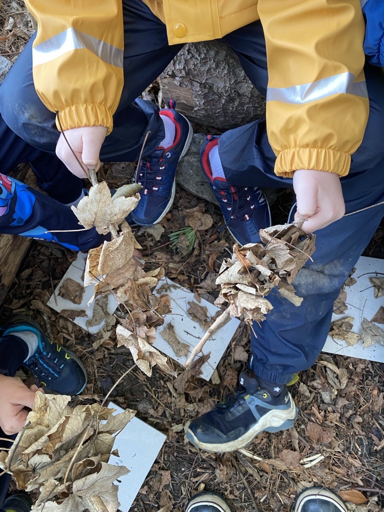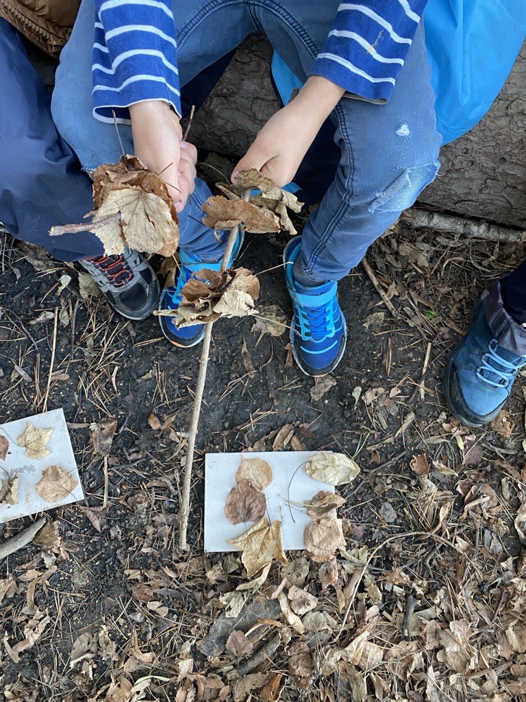 On a crée nos dizaines en enfilant 10 feuilles sur un bâton et on a composé petit à petit notre nombre du jour !